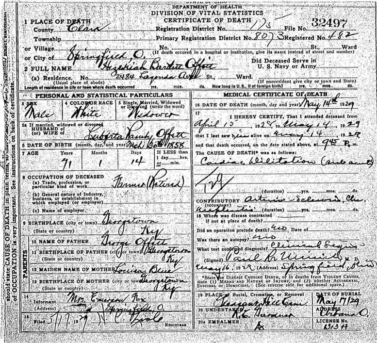 Ohio Death Certificate for Hezekiah Bartlett Offett