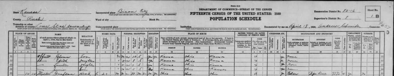 1930 Federal Census of Lone Star Township, Bison, Rush County, KS. Household of Irvin Offutt