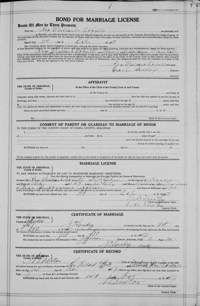 Desha County Arkansas Marriage Record for Rex W. Offutt to Matilda J. Marshall