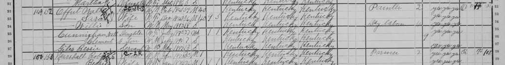 1900 Federal Census of Big Eagle Precinct, Magistgerial Dist. #3, Scott County, KY. Household of Wally Offutt