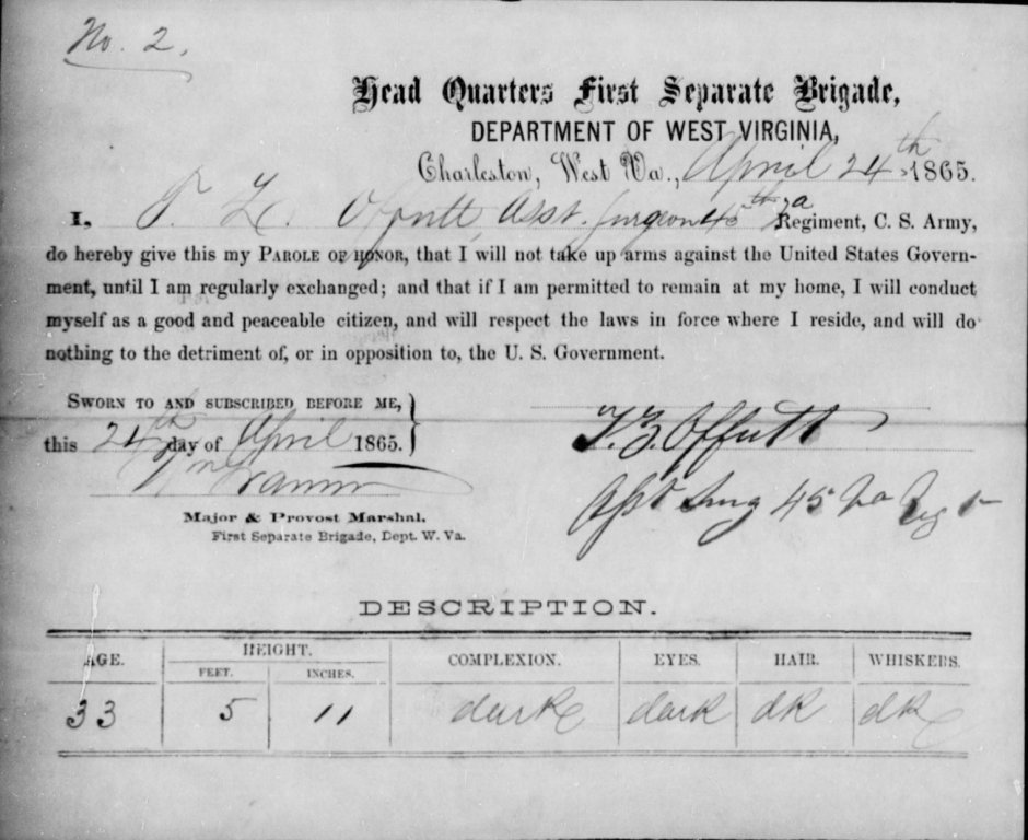 Parole of Honor for T. Z. Offutt, Asst. Surgeon, 45th VA dated April 24, 1865 in Charleston, WV