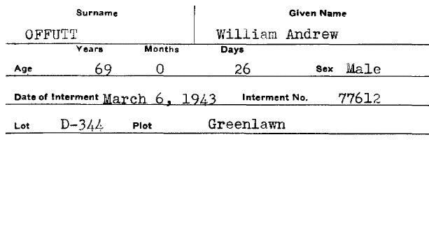 Internment card from Inglewood Park Cemetery for William Andrew Offutt
