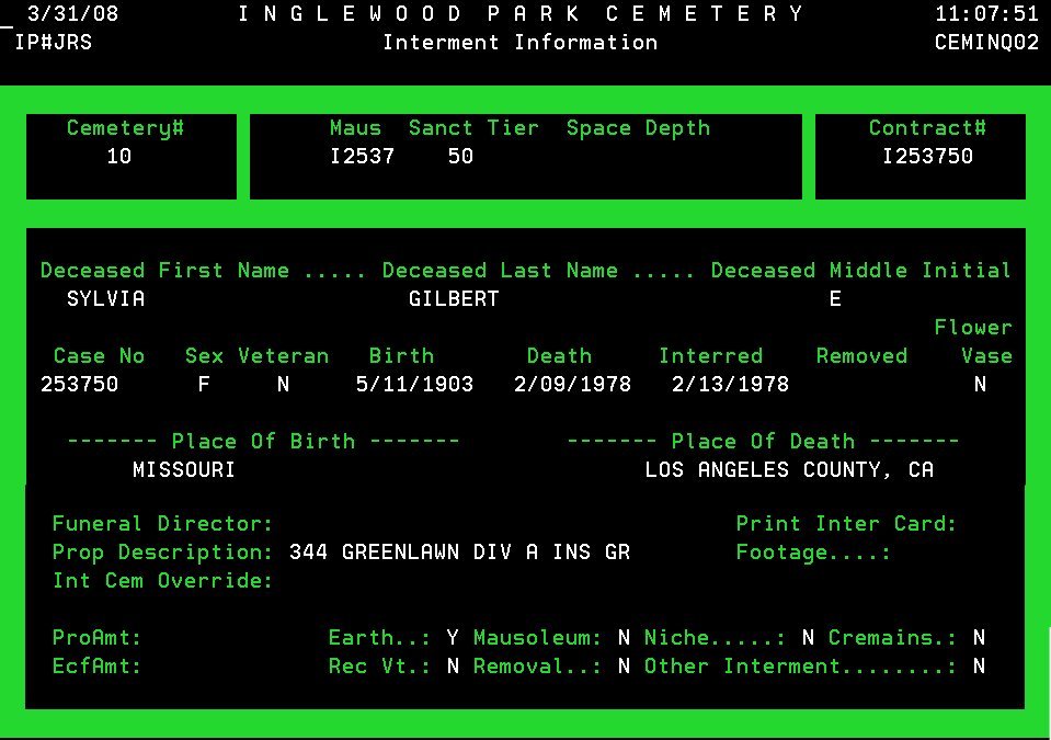 Internment card from Inglewood Park Cemetery for Sylvia E. Gilbert