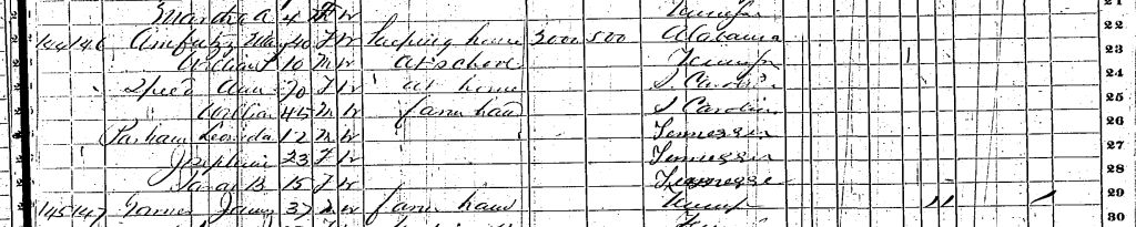 1870 Federal Census; 24th Civil District, Columbia PO, Maury County, TN. Household of Mary Offutt