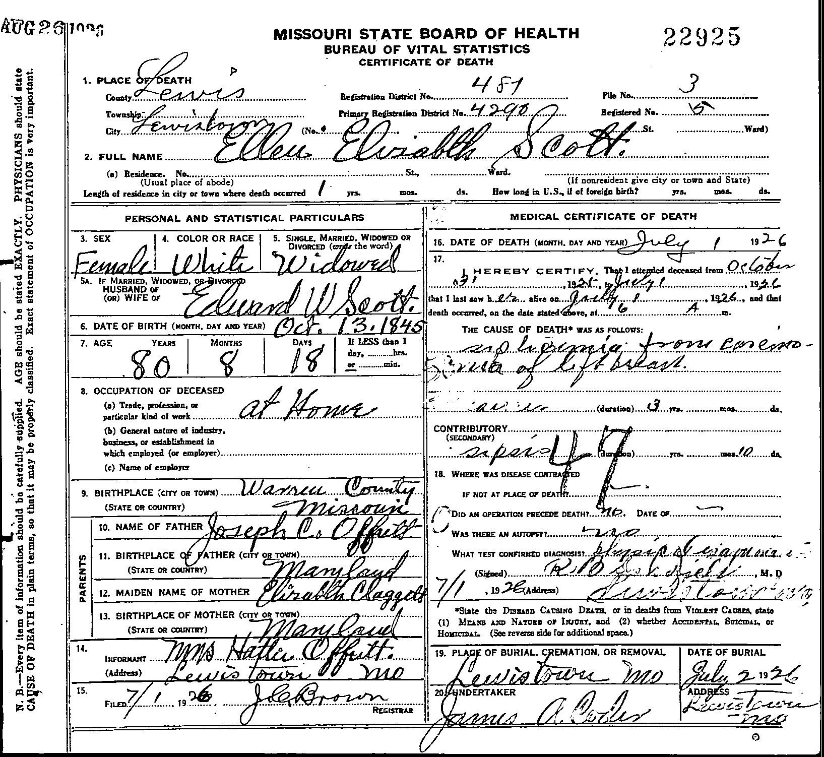 MO Death Certificate # 22925 for Ellen Elisabeth (Offutt) Scott