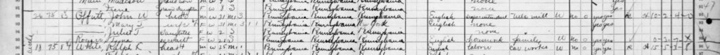 1910 Federal Census; Ellwood City, Lawrence County, PA. Household of John W. Offutt