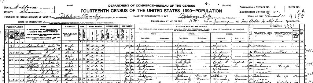 1920 Federal Census; Petaluma, Sonoma County, CA. Household of Charles A. Offutt