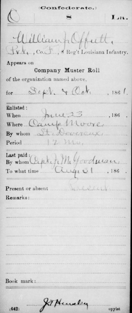 Compiled Service Record for William J. Offutt, 8th LA Inf CSA