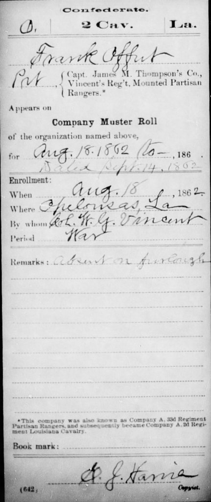 Compiled Service Record for Frank Offut, 2nd LA Cavalry CSA