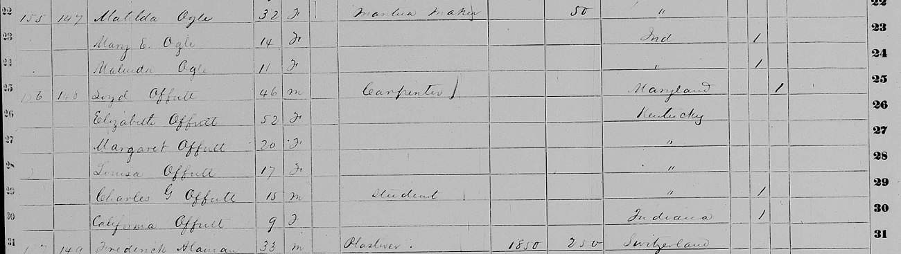 1860 Federal Census; Hancock County, IN. Household of Loyd Offutt