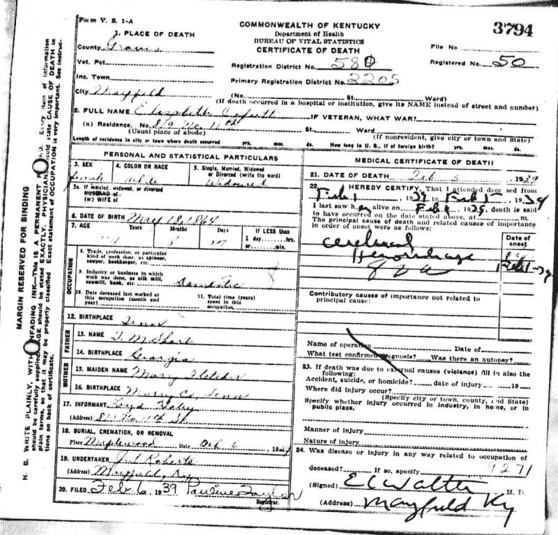 Death Certificate for Elizabeth Offutt