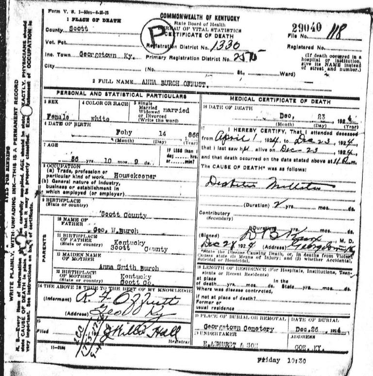 Death Certificate for Anna Burch Offutt