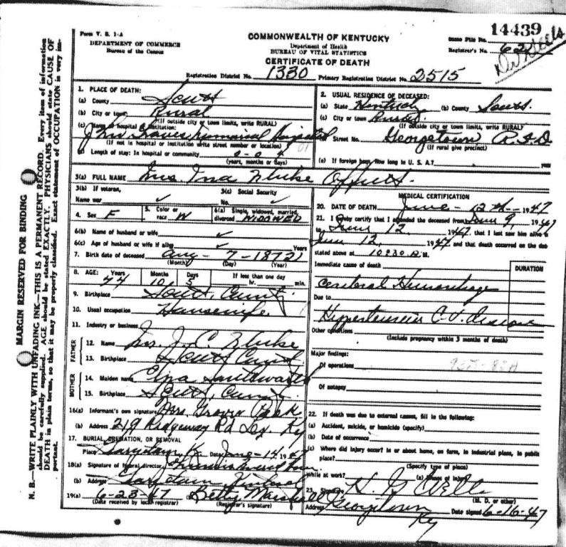 Death Certificate for Ina Fluke Offutt