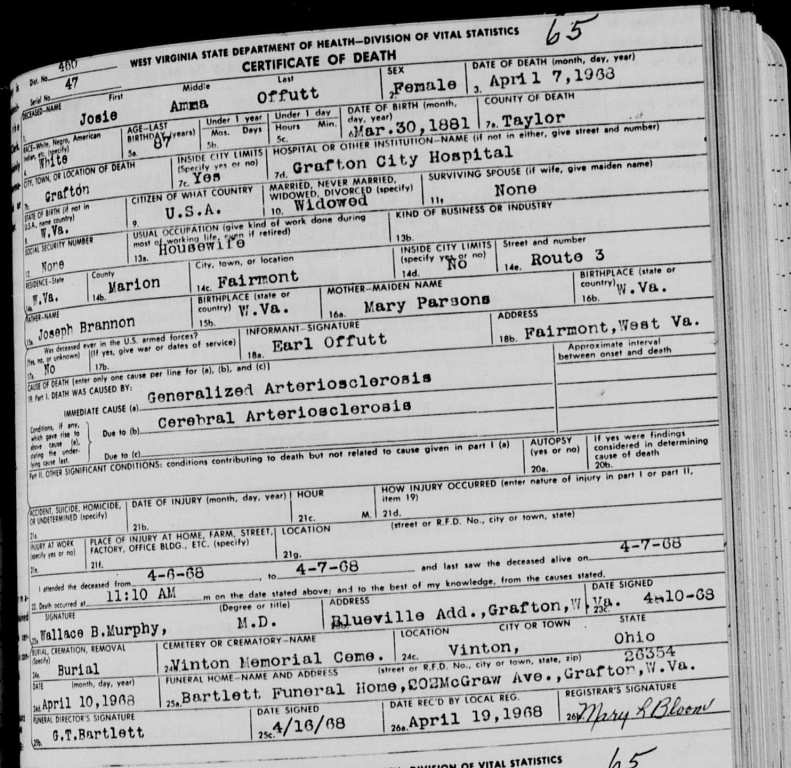 West Virginia Death Certificate for Josie A. Offutt