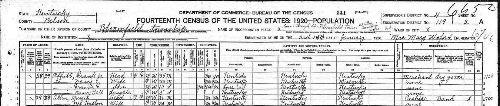 1920 Fed Census of KY; Household of Frank Offutt Jr.
