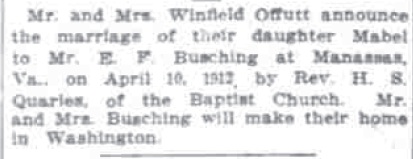 Wedding notice for Mabel Offutt to Mr. E. F. Busching