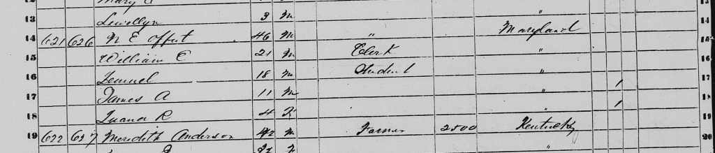 1850 Federal Census; District 2, Harrison County, Kentucky. Household of N. E. Offut