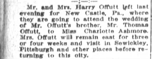 Wedding of Thomas Offutt to Miss Charlotte Ashmore