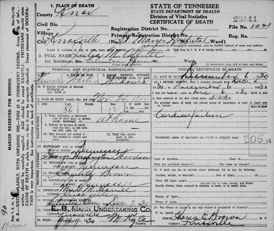 State of Tennessee; Certificate of Death for Julia M. Offutt