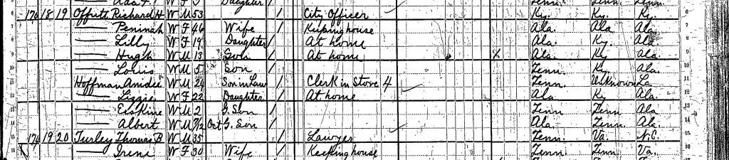 1900 Federal Census; 14th Civil District, Memphis, Shelby County, TN. Household of Anndy Hoffman