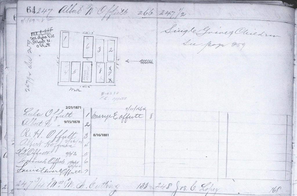 Page 247 of the Elmwood Cemetery Plot Book, showing the Offutt plot