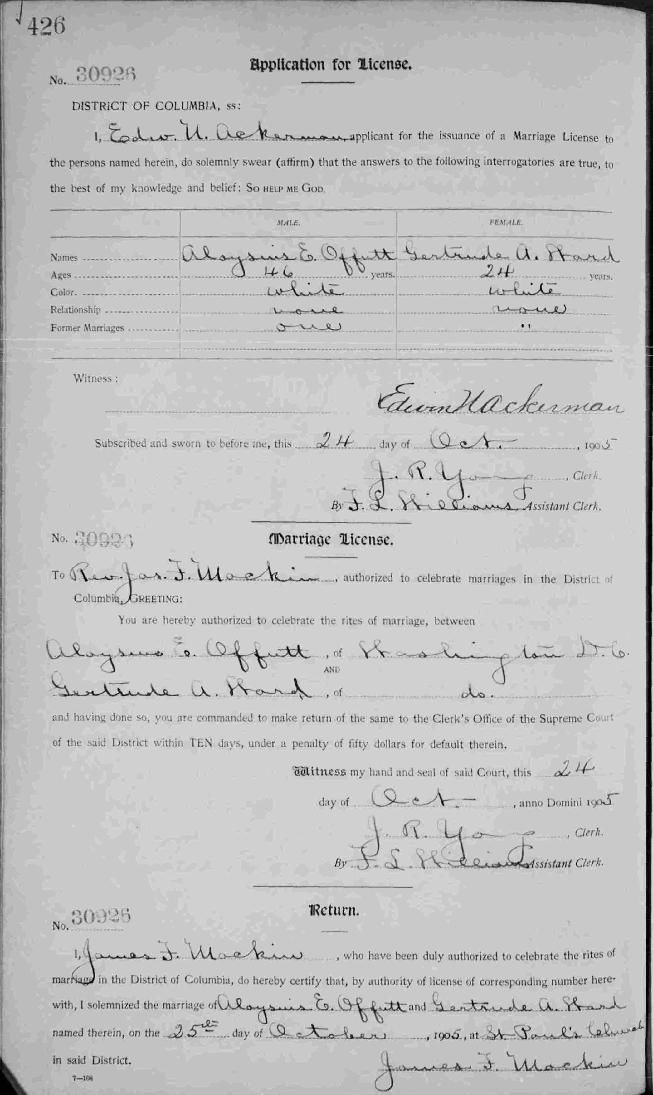 Marriage Application, License and Return of Marriage for Aloysius E. Offutt and Gertrude Ward