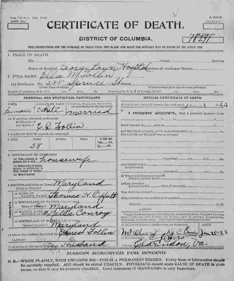 District of Columbia Death Certificate for Ella M. Follin
