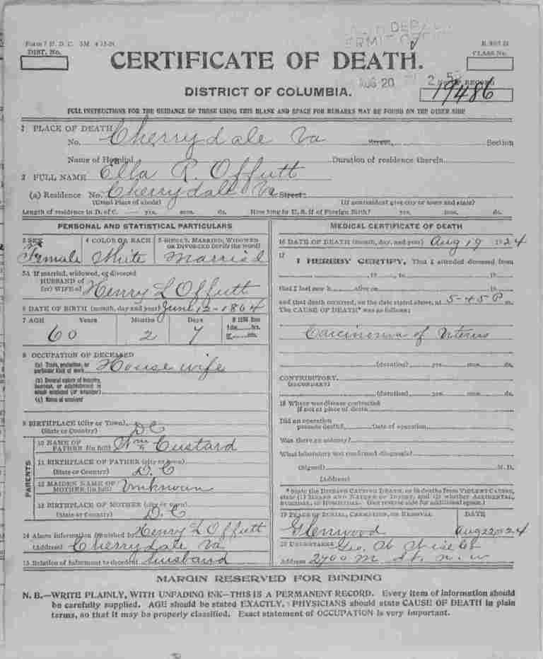 District of Columbia Death Certificate for Ella R. Offutt