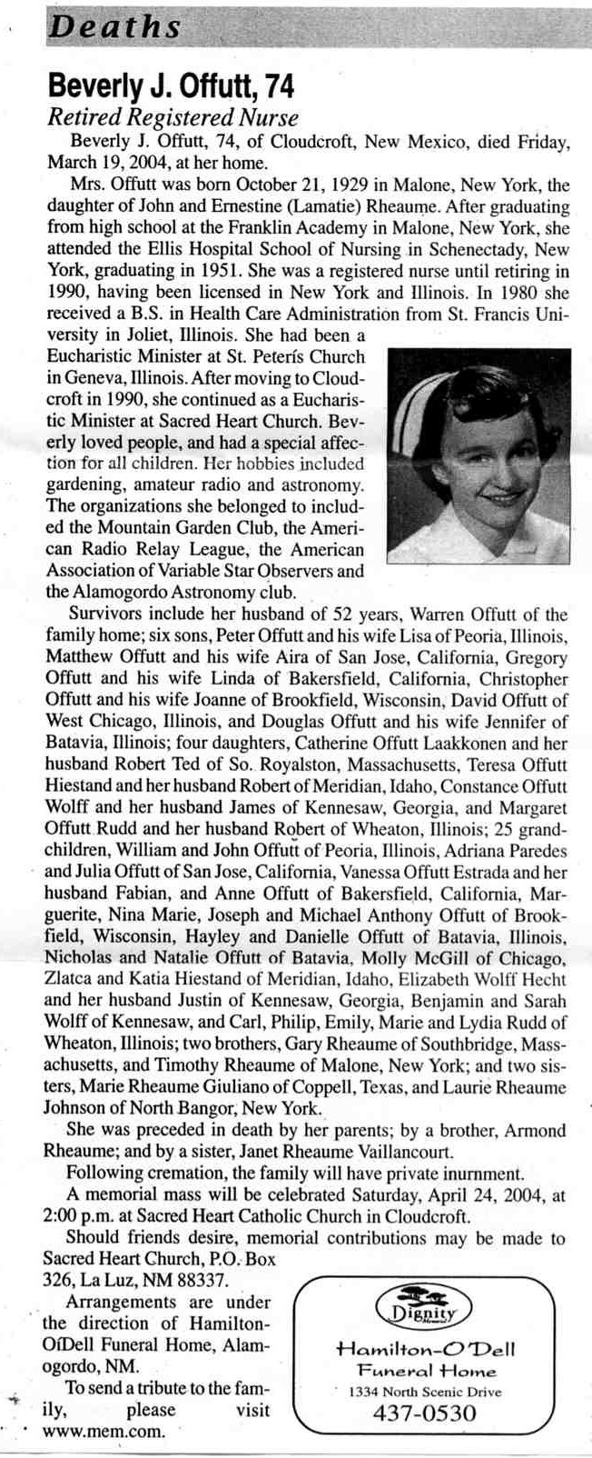Obituary for Beverly J. Offutt; printed in the Alamogordo Daily News, March 23, 2004