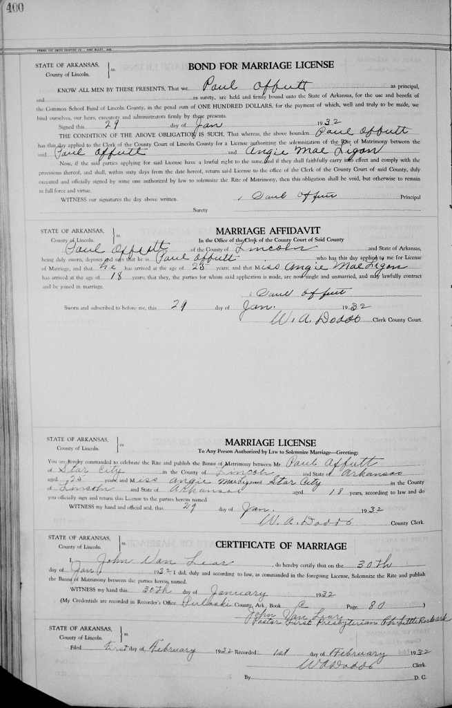 Marriage of Paul Offutt to Angie M. Ligon