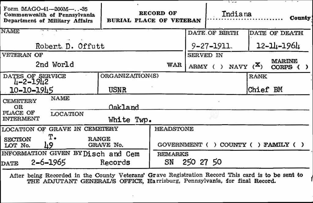 Burial Card for Robert D. Offutt