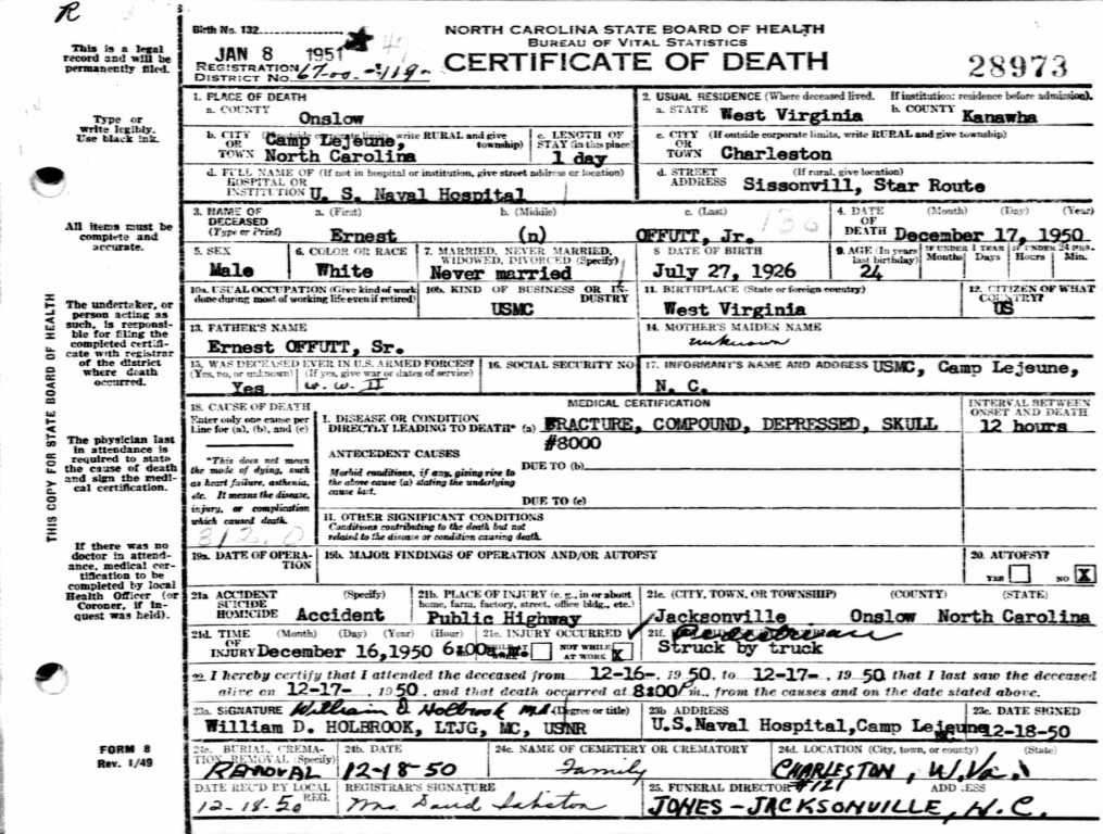 NC Death Cert. for Ernest Offutt Jr