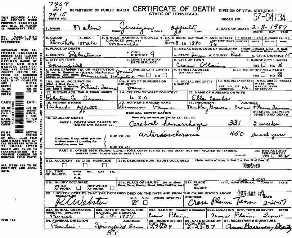 State of Tennessee; Certificate of Death for Nolen J. Offutt
