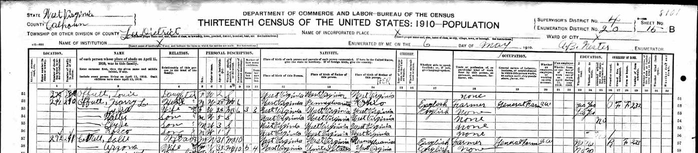1910 Census of Lee, Calhoun County, WV; Harry L. Offutt