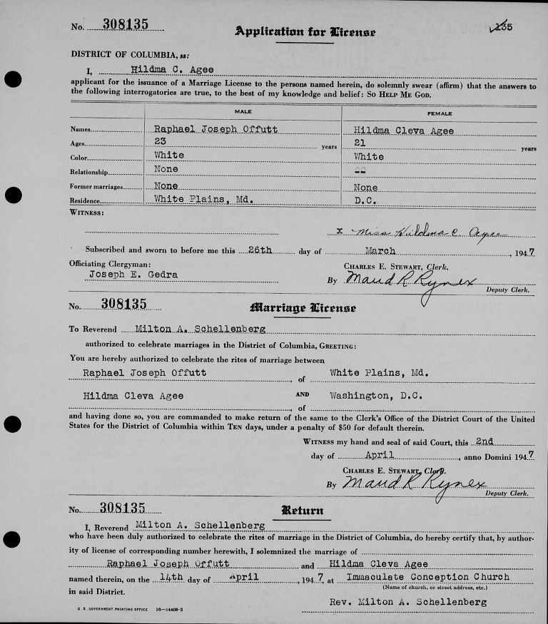 Marriage Record for Raphael Joseph Offutt & Hildma Cleva Agee