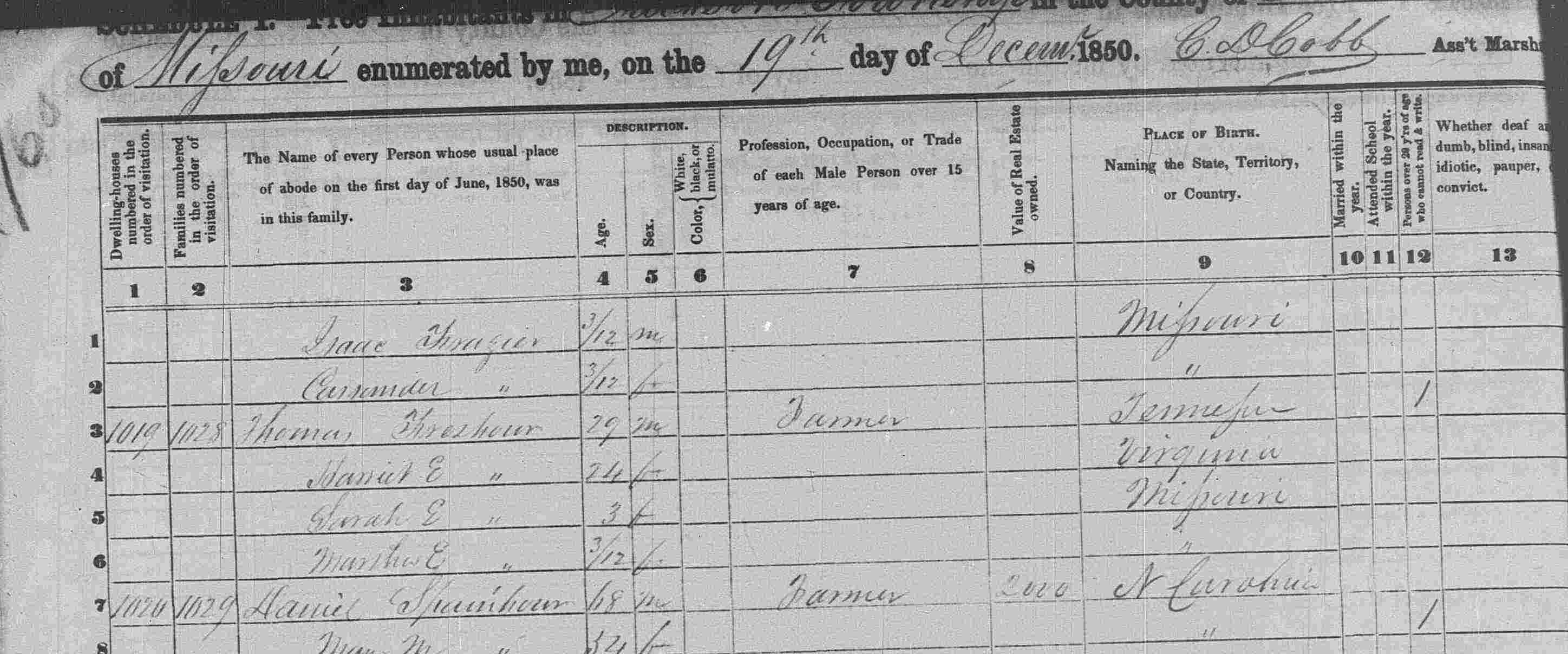 1850 Federal Census; Jackson, Johnson County, MO. Household of Thomas Freshour