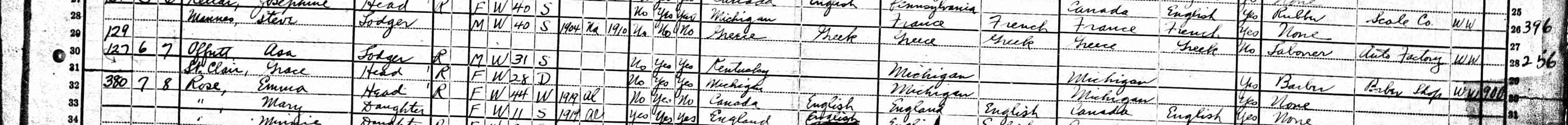 1920 Federal Census; Household of Grace St. Clair, lists Asa Offutt as a lodger
