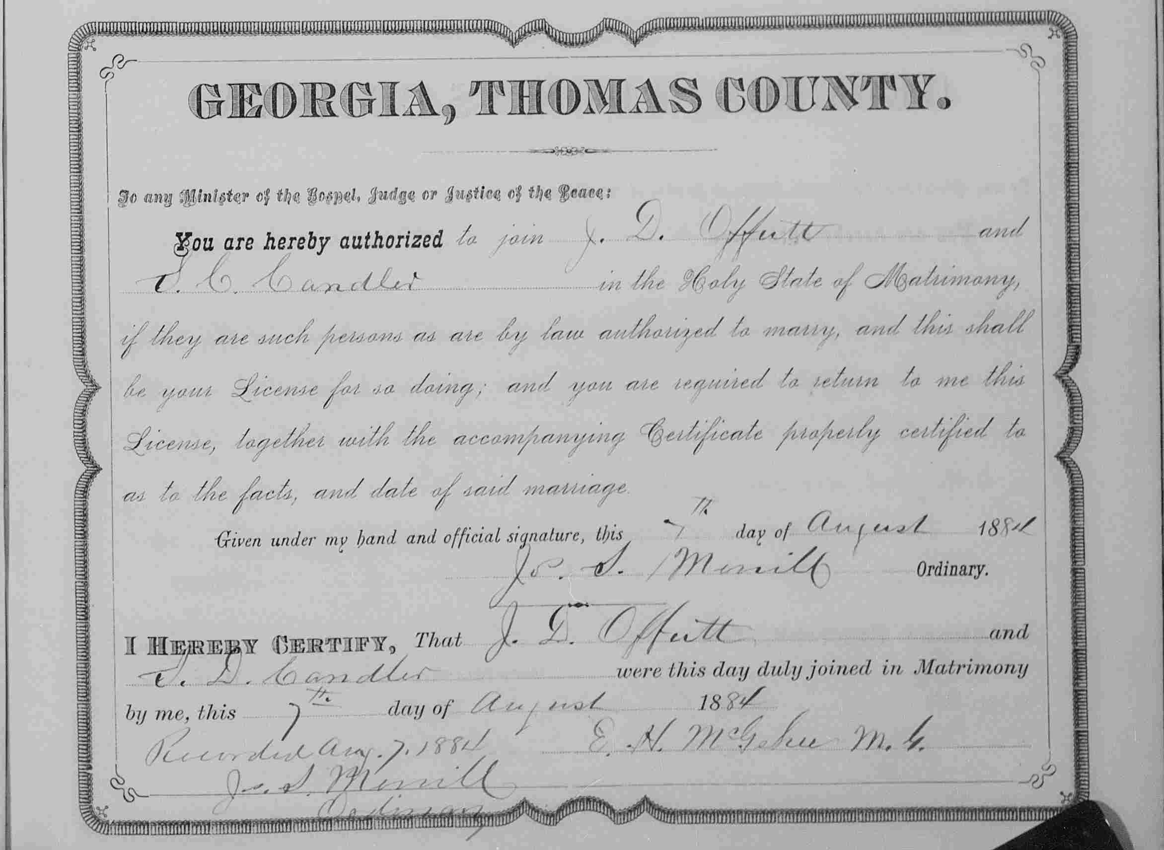 Marriage record for J. D. Offutt to S. C. or S. D. Candler