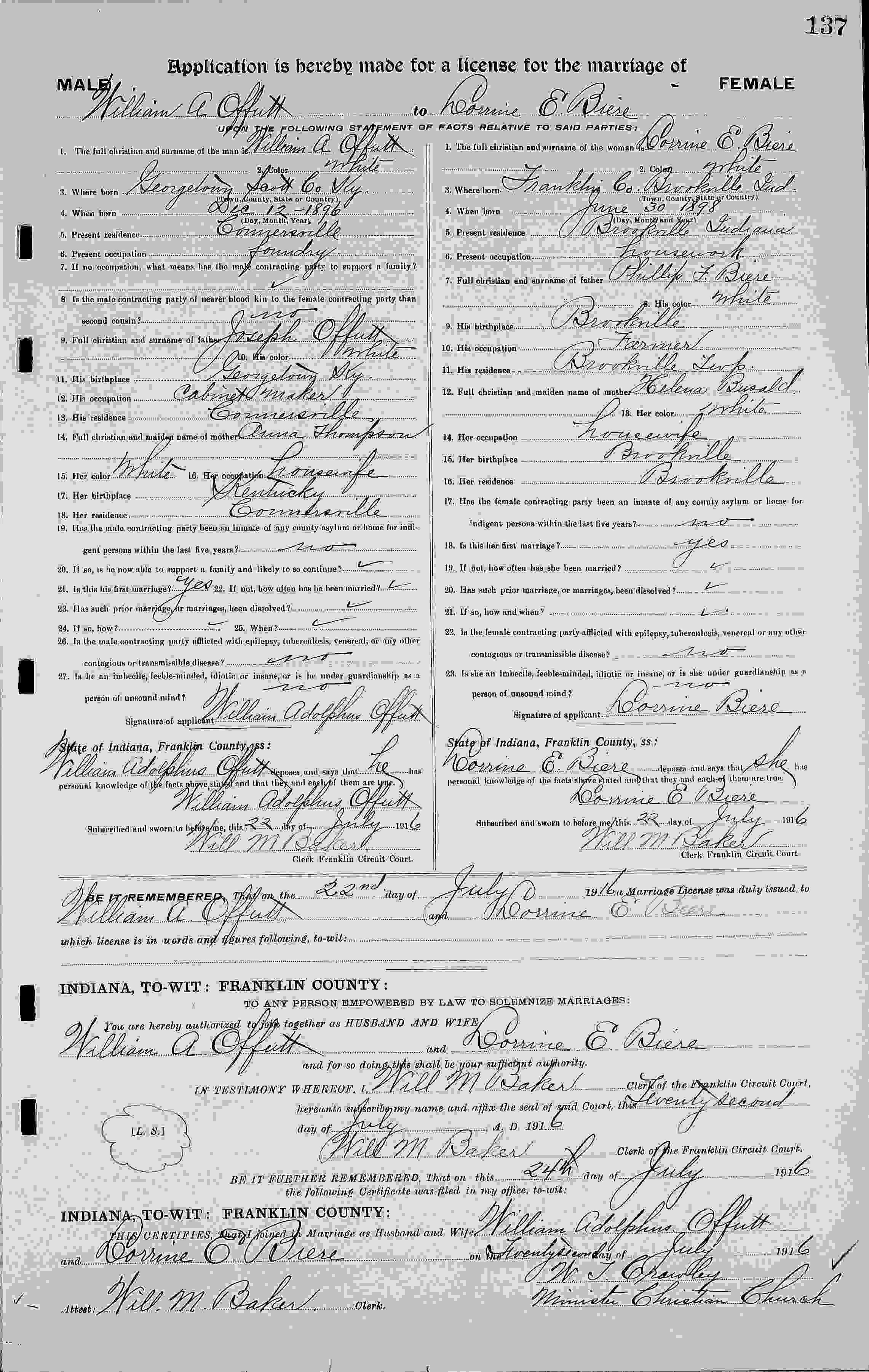 Marriage License for William Adolphus Offutt to Lorrine E. Biere