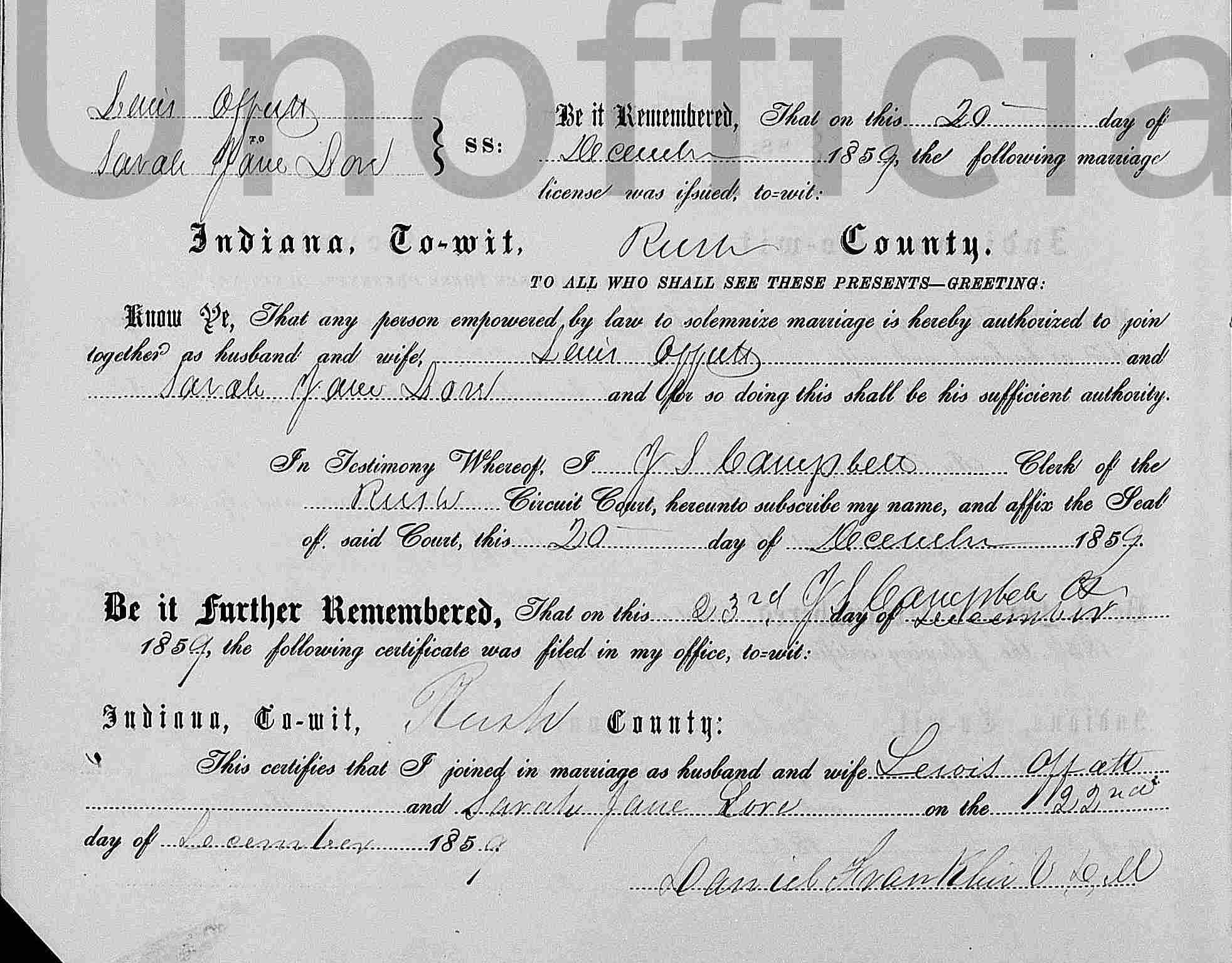 Marriage License and Return for Lewis Offutt and Sarah Jane Low