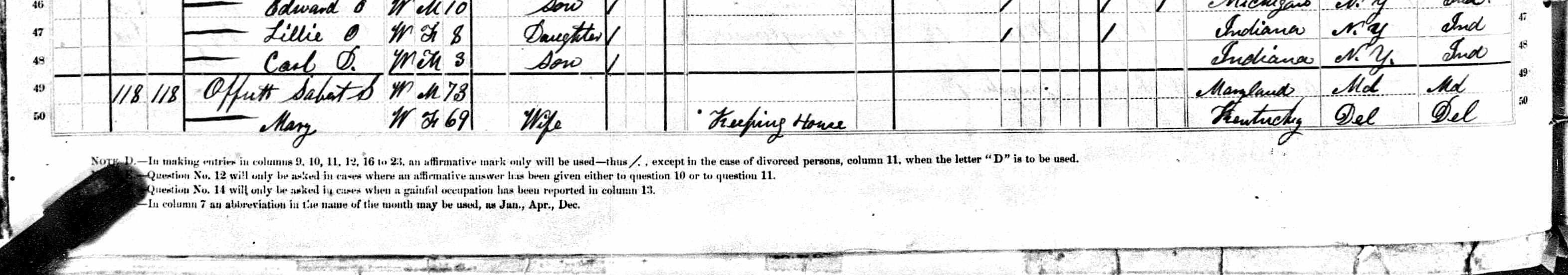 1880 Federal Census; Posey Township, Rush County, IN. Household of Sabert Offutt