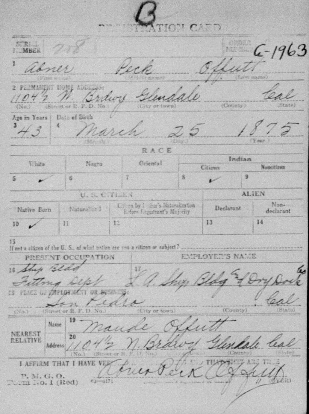 World War I Draft Registration; Abner P. Offutt