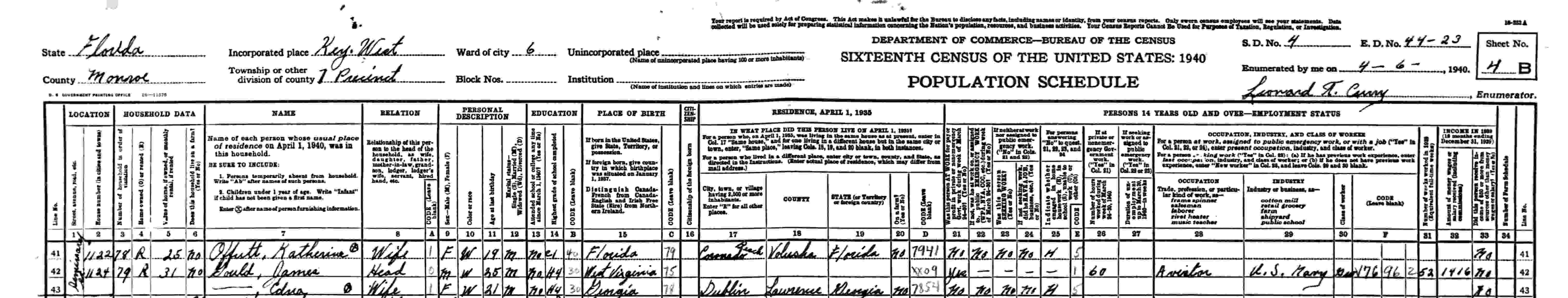1940 Federal Census; Key West, Monroe County, FL. Household of John R. Offutt