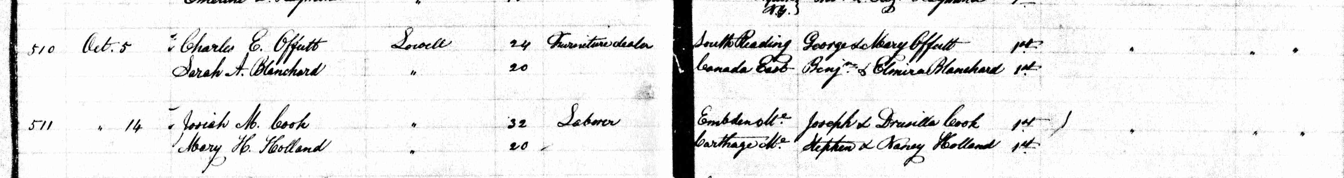 Marriage Registry for Lowell Massachusetts; shows marriage of Charles E. Offutt and Sarah A. Blanchard