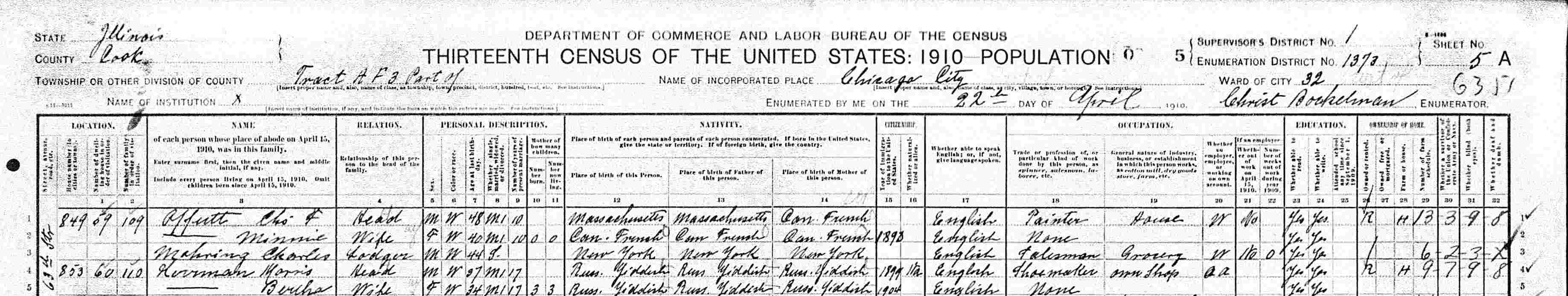 1910 Federal Census; Ward 32, Chicago, Cook County, IL. Household of Chs Offutt