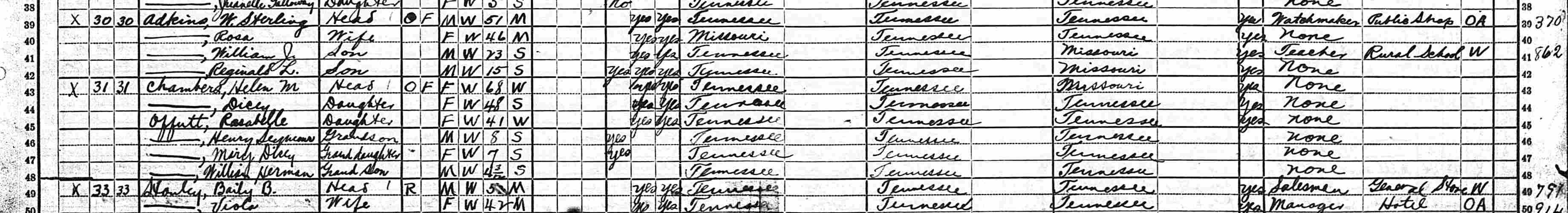 1920 Federal Census; Civil District 3, Scott County, TN. Household of Helen M. Chambers