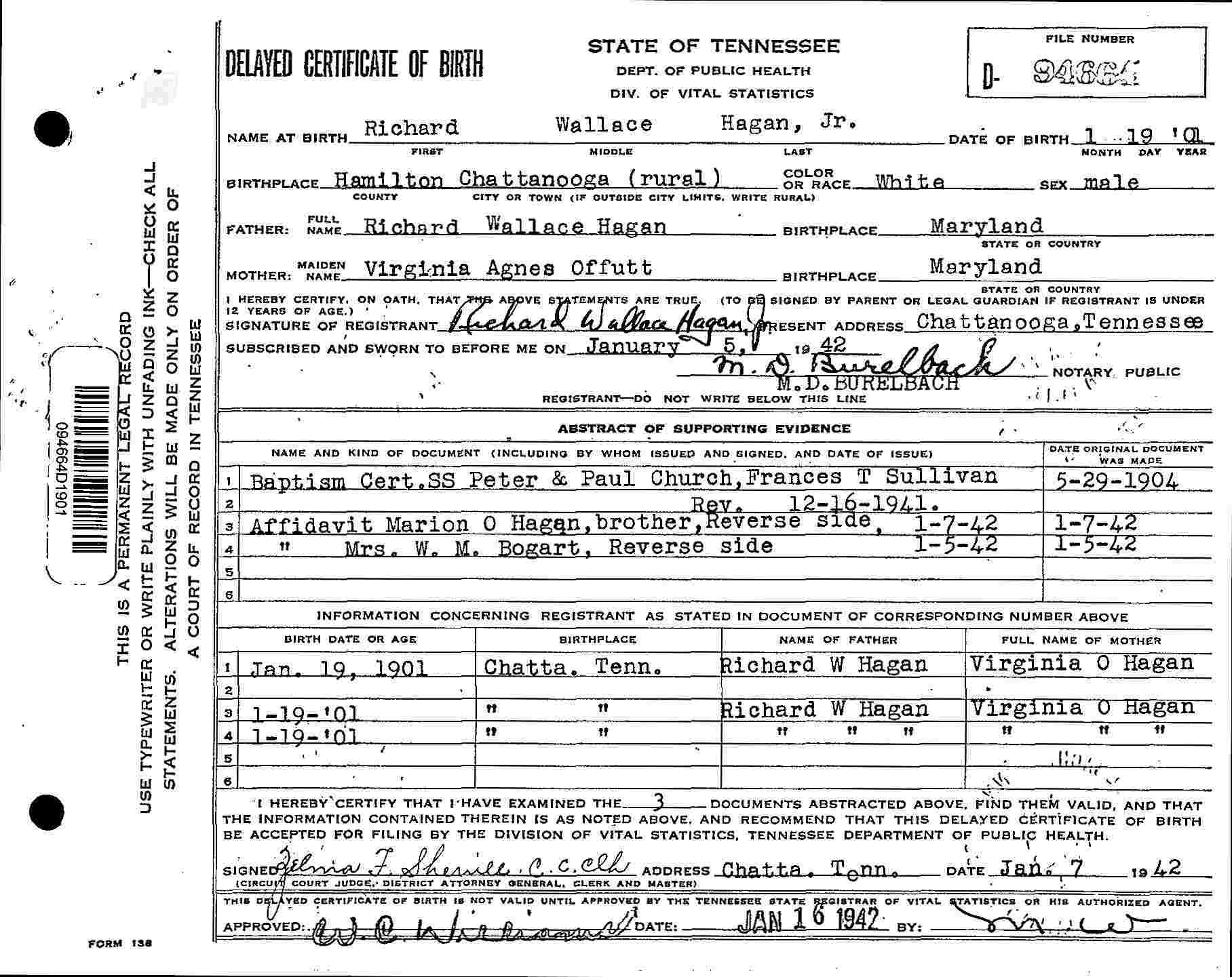 Tennessee Delayed Birth Certificate for Richard Wallace Hagan Jr.
