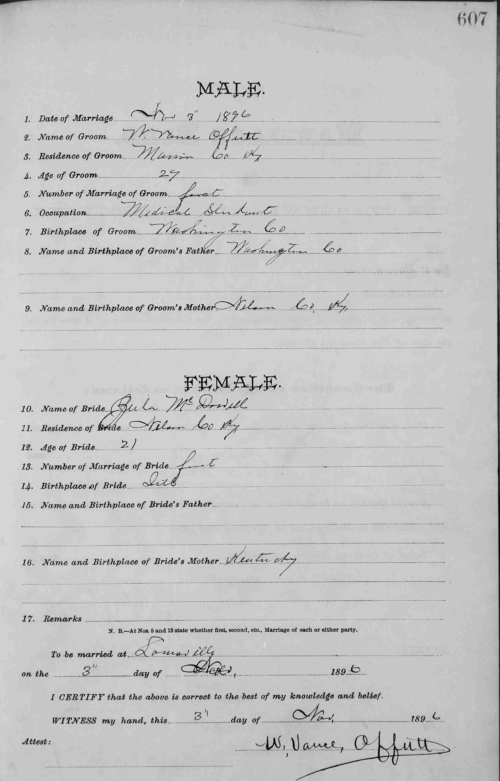 Marion County KY Marriage Record for Wm. Vance Offutt to Zula McDowell
