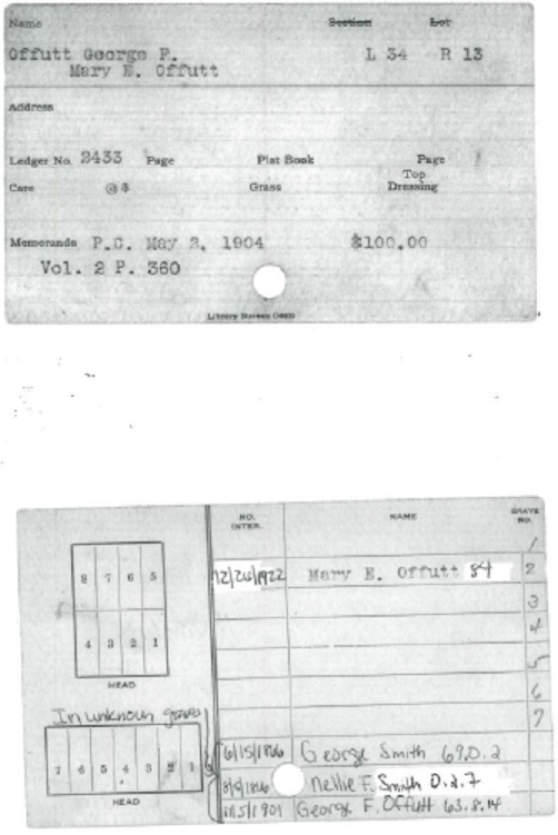 Lot 34 Range 13 Owners Card; Owner of Lot George F. & Mary E. Offutt