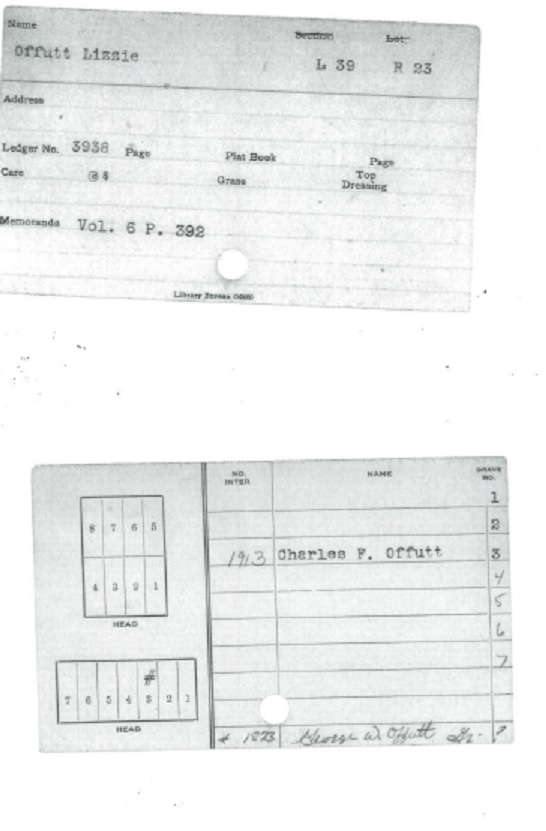 Lot 39 Range 23 Owners Card; Owner of Lot Lizzie Offutt